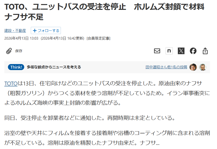 TOTOユニットバス受注停止